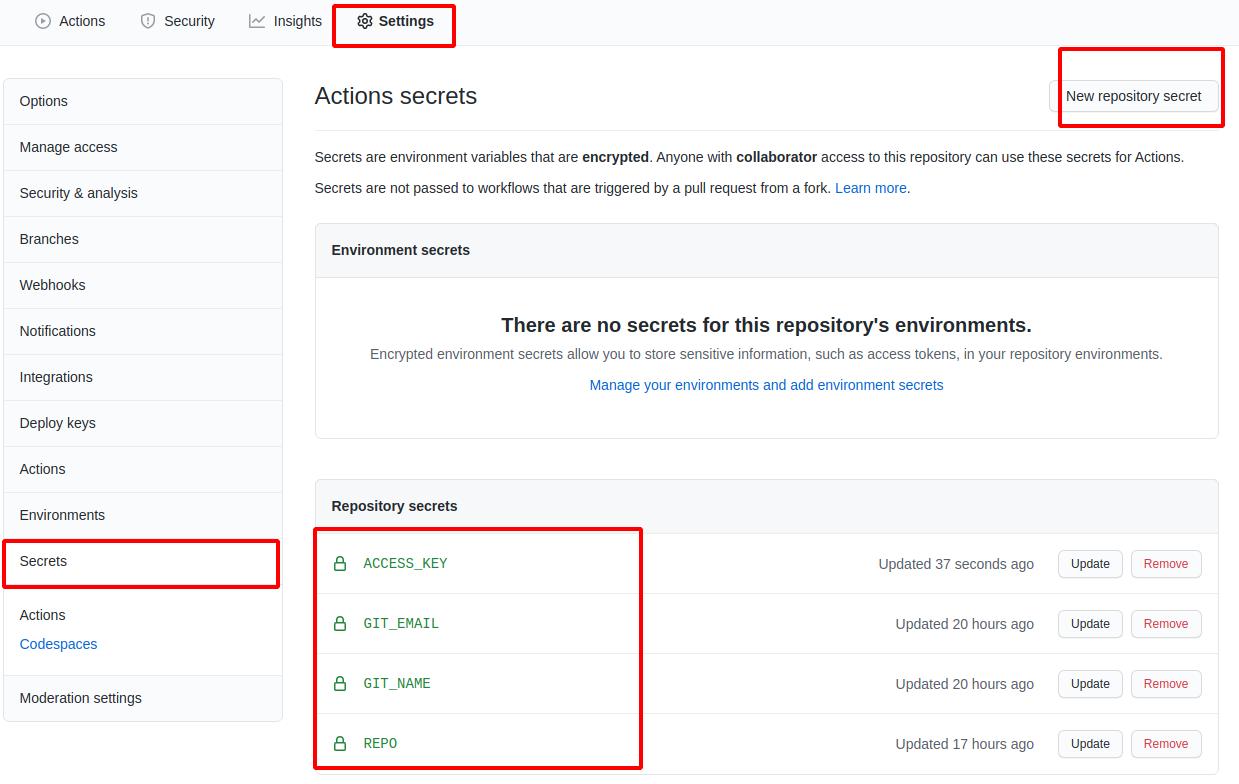然后点击Secrets,设置秘密键值对, 需要设置的变量有:
